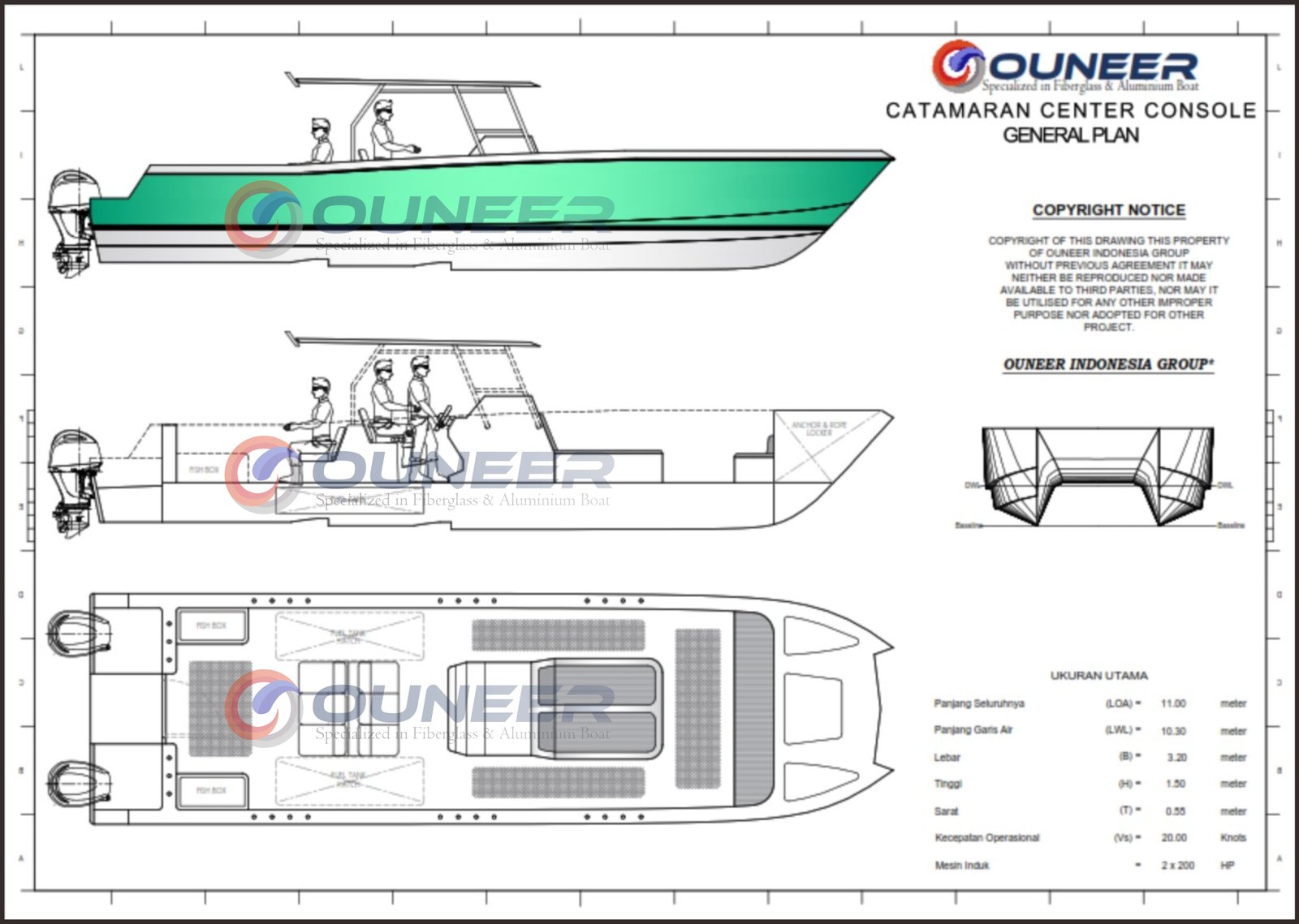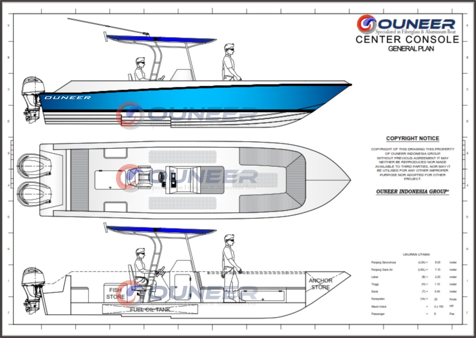 Berikut adalah spesifikasi teknis untuk center console boat buatan PT. Ouneer Indonesia group :