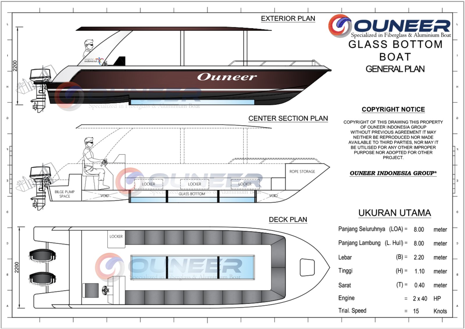 Glass Bottom Boat 8 Meter dari Ouneer dirancang khusus untuk wisata bahari seperti snorkeling trip, coral viewing, dan family tour. Dengan konstruksi fiberglass marine grade, kapal ini kuat, ringan, dan hemat perawatan. Dua panel lantai kaca (glass bottom) memberikan pandangan jernih ke terumbu karang dan biota laut tanpa harus menyelam.