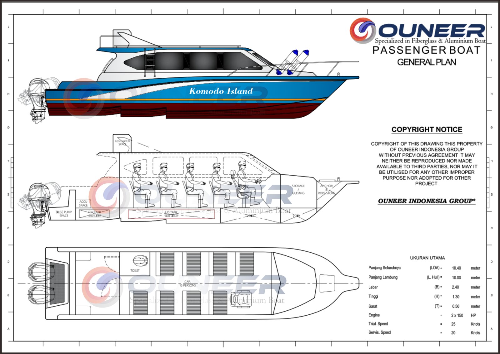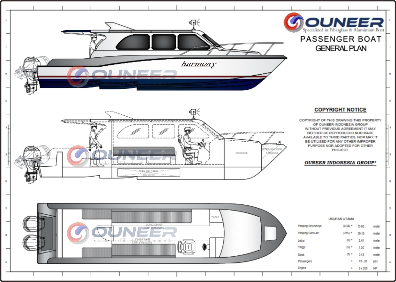 Berikut adalah spesifikasi teknis speed boat penumpang 10 meter fiberglass buatan ouneer indonesia :