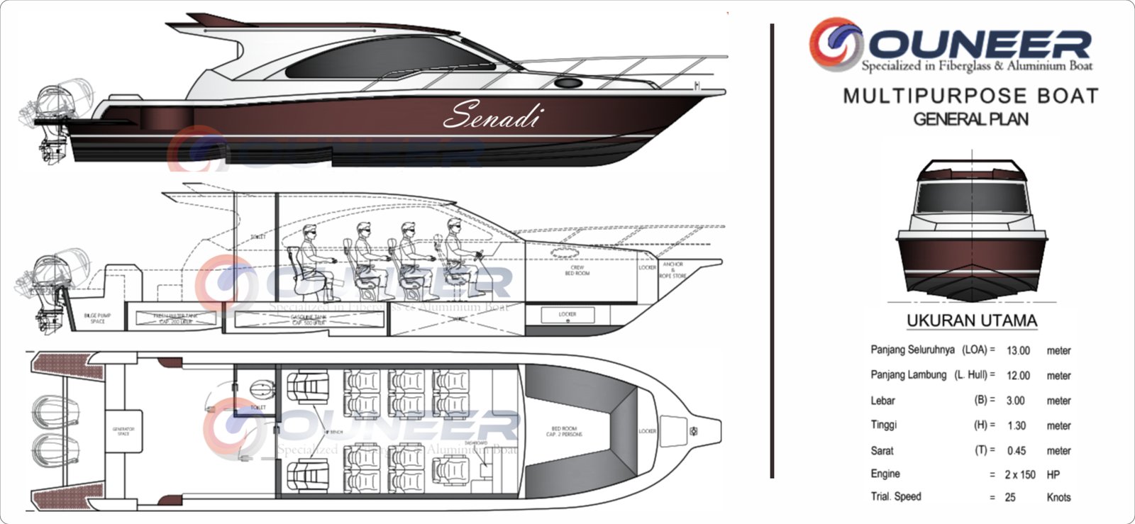 Jika Anda membutuhkan crew boat atau speed boat patroli 16 meter dengan desain modern, mesin bertenaga, dan fasilitas lengkap, Ouneer Indonesia siap menjadi mitra terbaik Anda.