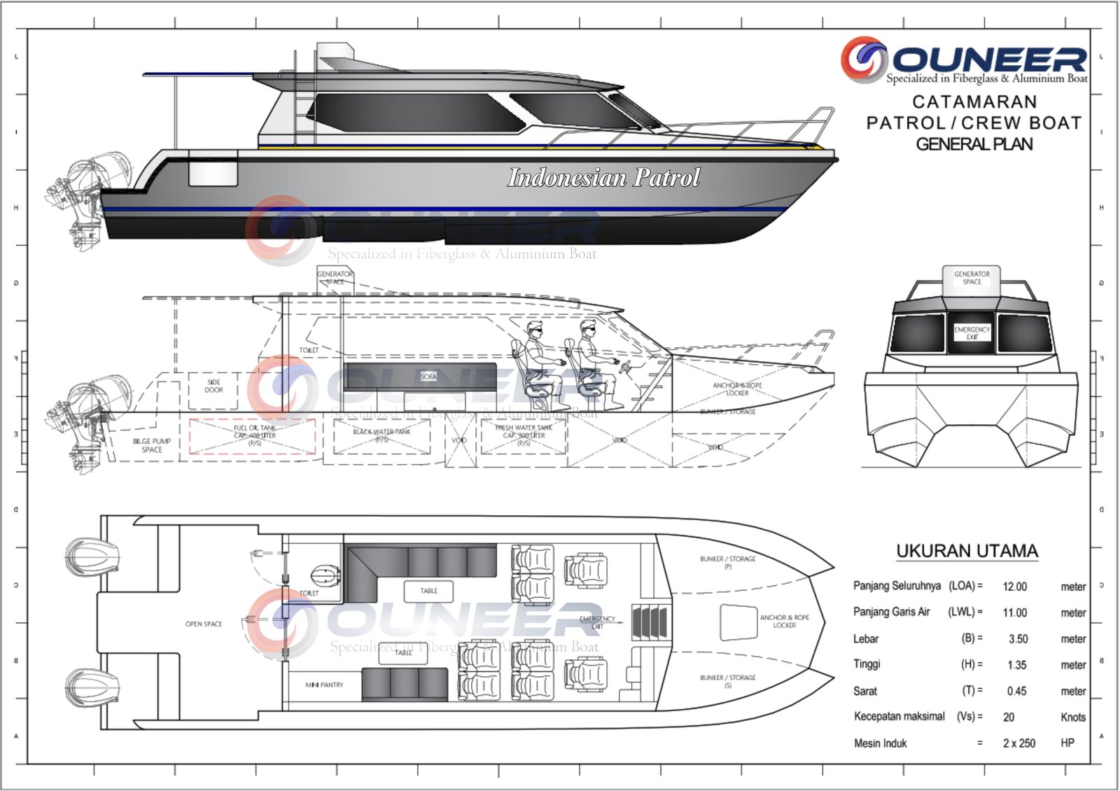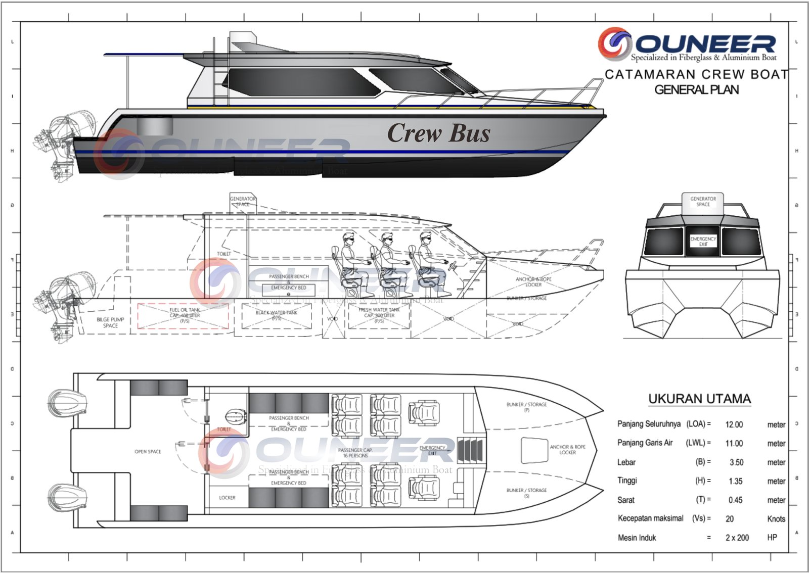 Aluminium Boat Catamaran 12 Meter dari PT Ouneer Indonesia Group merupakan kapal profesional yang dirancang khusus untuk transportasi kru dan logistik ringan.