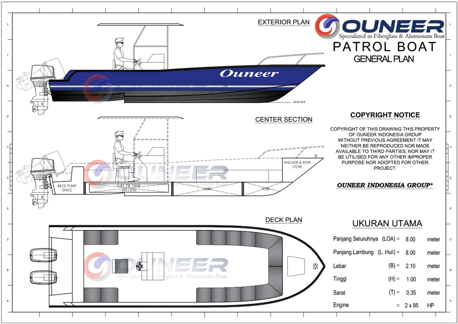Ditenagai oleh 2 × 85 HP, boat ini lincah, responsif, dan stabil di berbagai kondisi perairan. Layout dek dirancang luas dan ergonomis, memberikan ruang yang nyaman bagi tim patroli, peralatan kerja, maupun personel keamanan. Tangki bahan bakar 300 liter ditempatkan di bawah dek untuk menjaga stabilitas dan jarak tempuh yang lebih jauh.