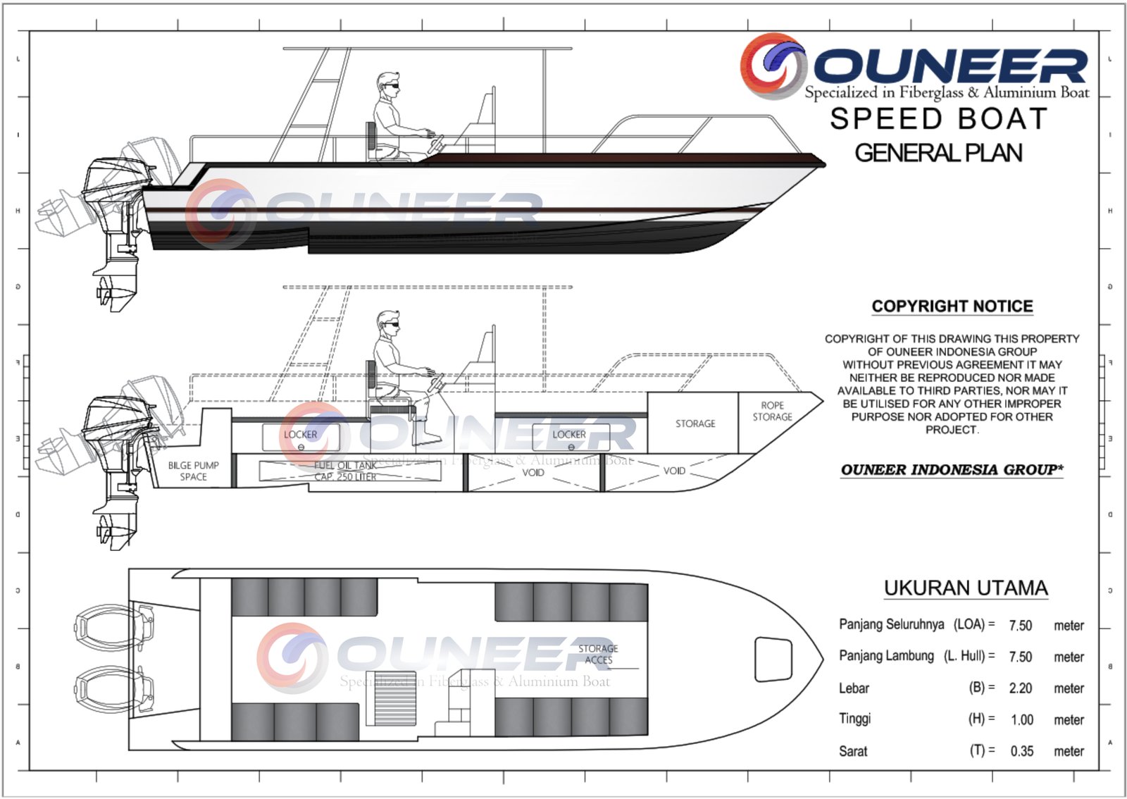 Speed Boat Wisata Ouneer dirancang khusus untuk kebutuhan transportasi wisata bahari yang mengutamakan kenyamanan, keamanan, dan pengalaman perjalanan yang menyenangkan. Dengan desain lambung modern dan teknologi step-hull, kapal ini mampu memberikan perjalanan yang halus, stabil, dan minim hentakan, menjadikannya ideal untuk kegiatan tur laut, island hopping, penyebrangan cepat, maupun layanan charter wisata.